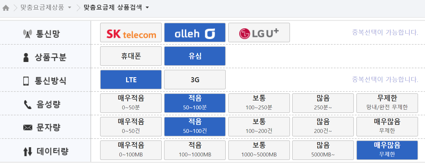 자신의 사용 패턴을 입력하면 그에 맞는 알뜰 요금제를 추천해줍니다.