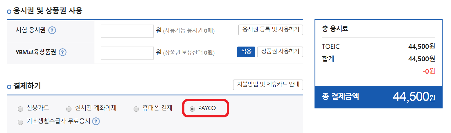 YBM 토익 홈페이지에서 온라인접수를 하면 위와 같이 결제 수단을 선택하는 순서가 옵니다. 이 중에서 PAYCO를 선택합니다.