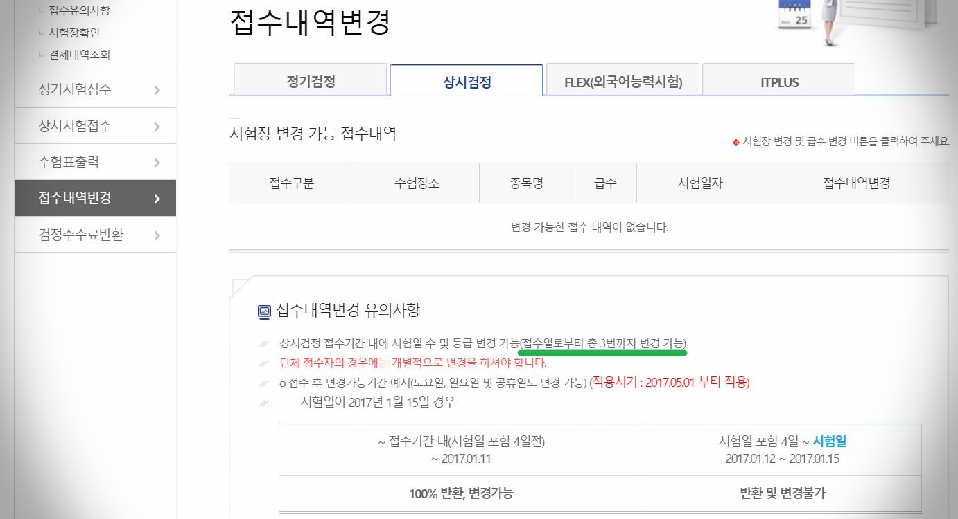 일정 변경은 대한상공회의소 자격평가사업단 홈페이지에 들어가서 '접수내역변경'으로 들어가시면 돼요.