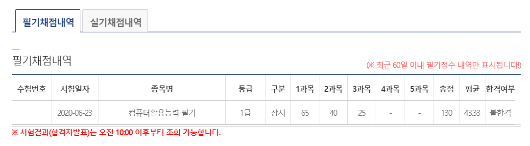 화요일에 컴활 1급 필기 상시시험을 보고 왔어요. 다음날 홈페이지에서 결과를 확인했는데... 불합격ㅠㅠ