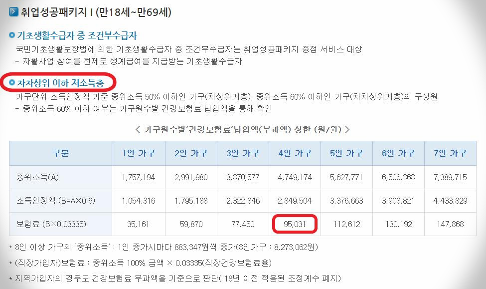 아빠의 건강보험료가 95,031원을 넘지 않아서 운좋게 취성패 1유형이 됐어요. 차상위 계층은 아니지만 차차상위 이하 저소득층에 해당되네요.
