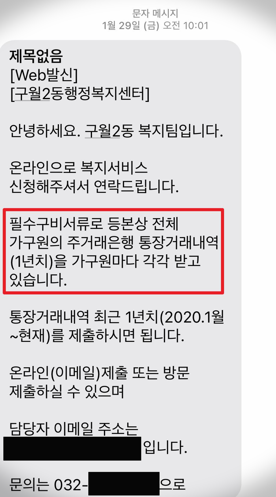 1월 29일 : 동 행정복지센터에서 문자, 1년치 통장거래내역 제출