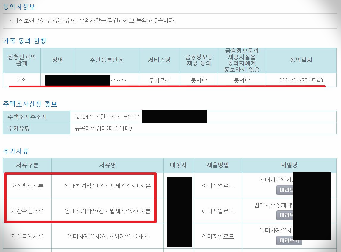추가서류는 자가가 아니기 때문에 임대차계약서 사본을 스캔해 업로드 했어요. 보증금을 추가로 더 낸 수정계약서도 있어서 2장 다 첨부했답니다.